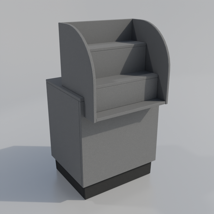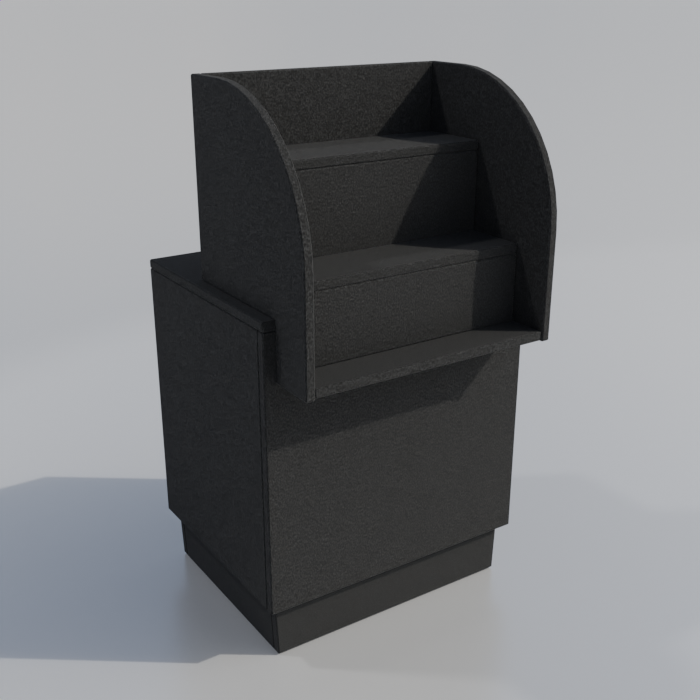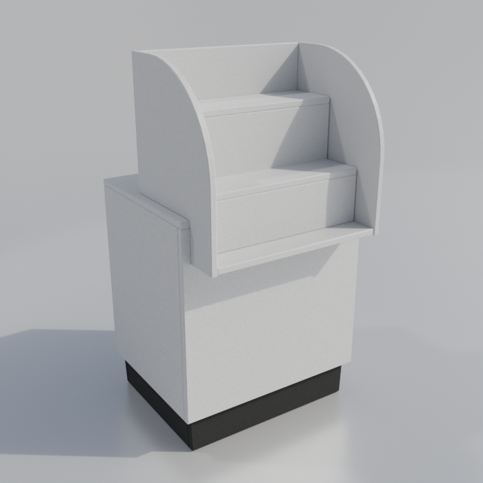 Корпус — ДСП, цоколь пластиковый, крепится к регулируемым опорам. В тумбе — 1 полка, 3 полки для открытой выкладки