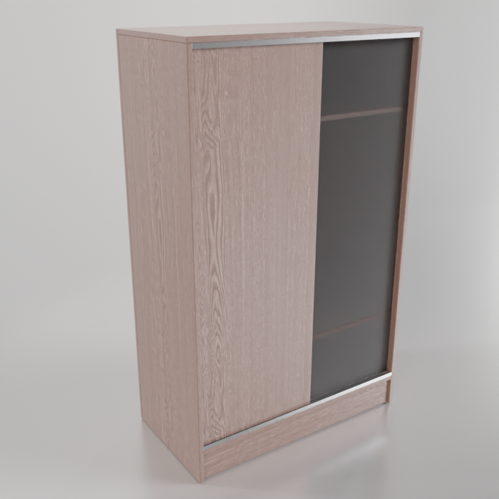 Корпус – ДСП, задняя стенка – ДВП, двери раздвижные с зеркалом. Две секции – одна для одежды, одна для папок “Корона”
