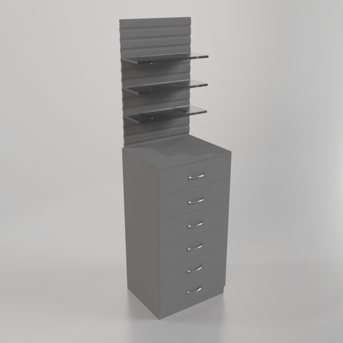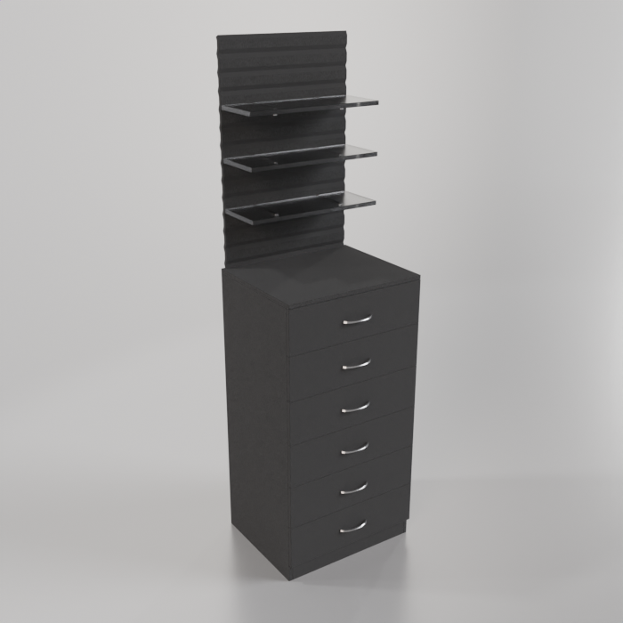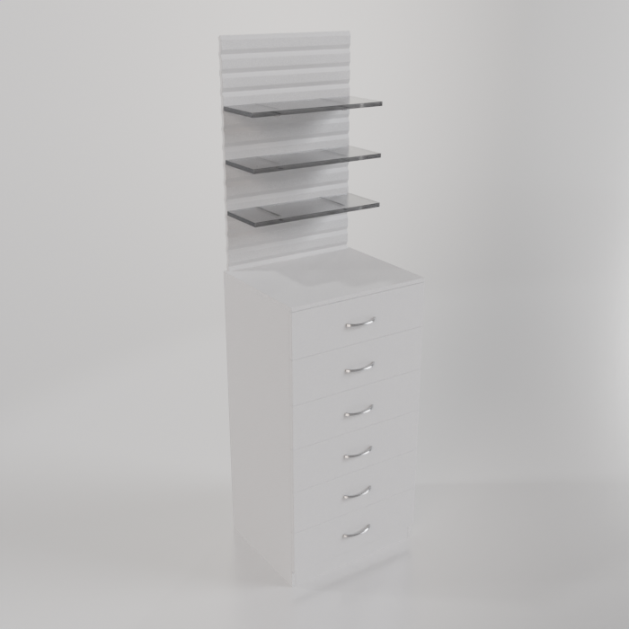 Материал — ДСП. 6 выдвижных ящиков, 3 полки стеклянные на экономпанелях с регулировкой высоты, ручки хром