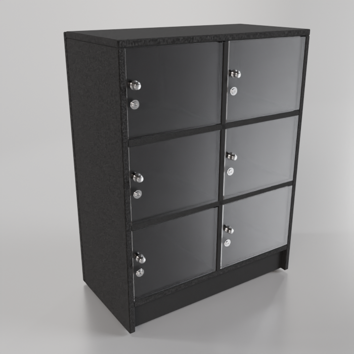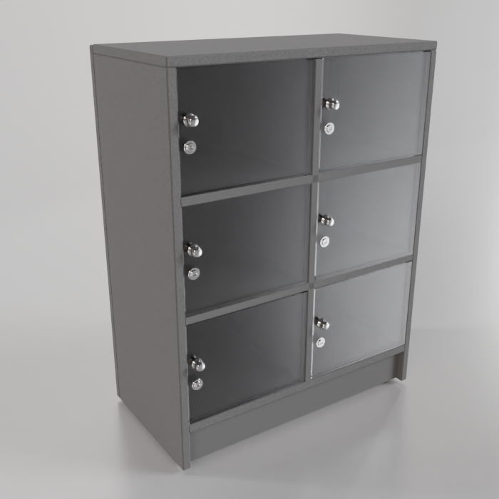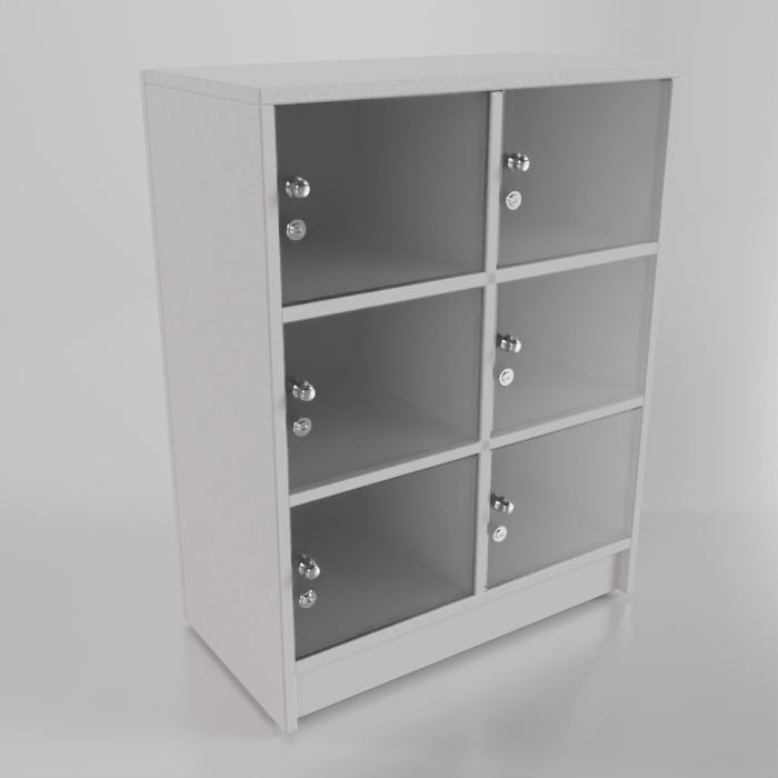 6 ячеек. Материал – ДСП и оргстекло. Ручка и замок для каждой ячейки. Задняя стенка ДВП